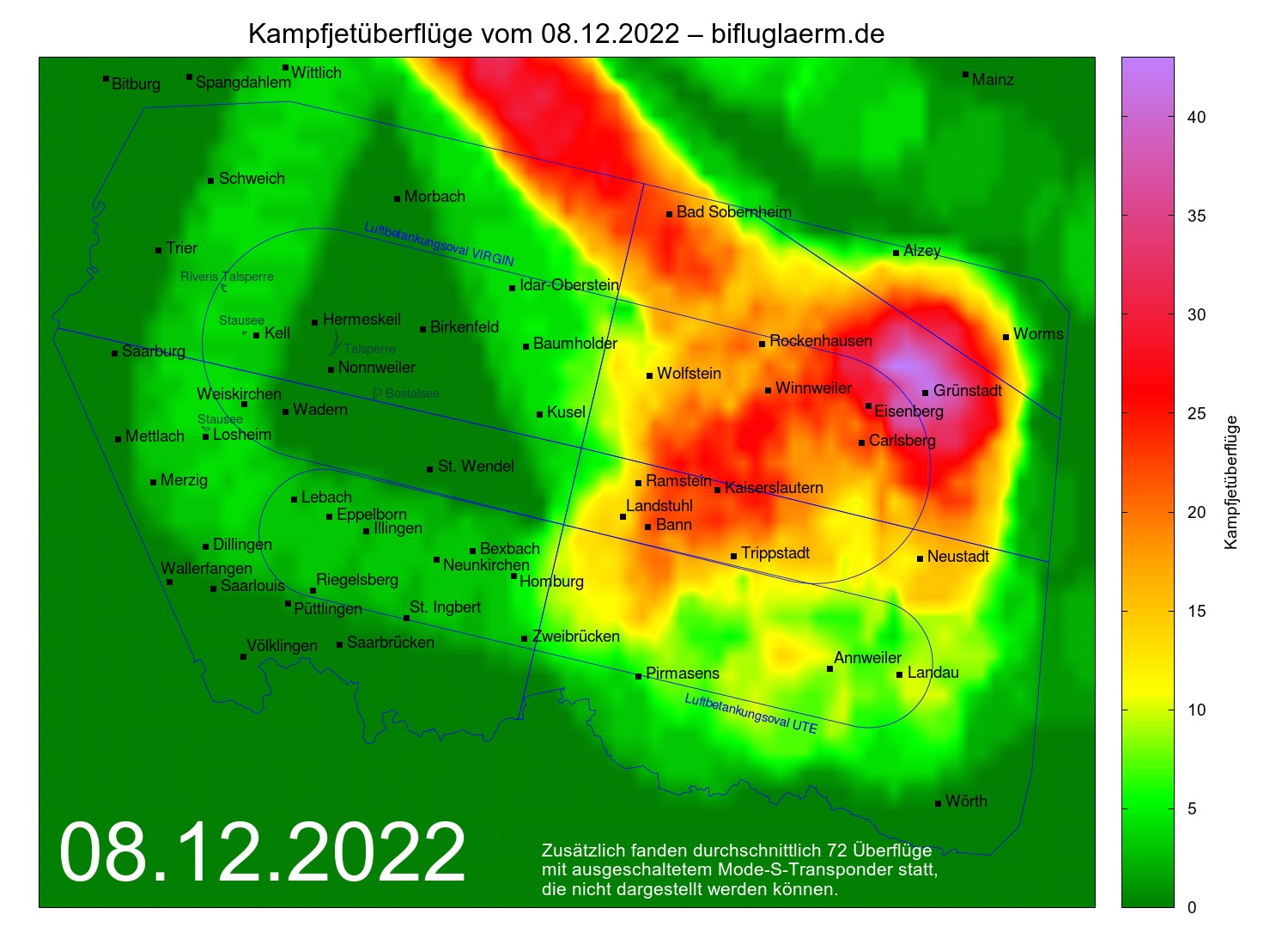 Am Donnerstag, 08.12.2022, sind im Saarland und angrenzenden Rheinland-Pfalz 3 Stunden und 52 Minuten lang Kampfjetflüge erfasst worden. In dieser Zeit sind summiert über alle Maschinen 22 Flugstunden und 59 Flugminuten angefallen, in denen ca. 137.900 Liter militärischer Treibstoff JP8 in Lärm, ca. 380.604 kg CO2 und ca. 1.103 kg NOx (Stickoxide) umgewandelt wurden. Das entspricht einer gefahrenen Strecke von 2.298.333 km mit dem Auto.